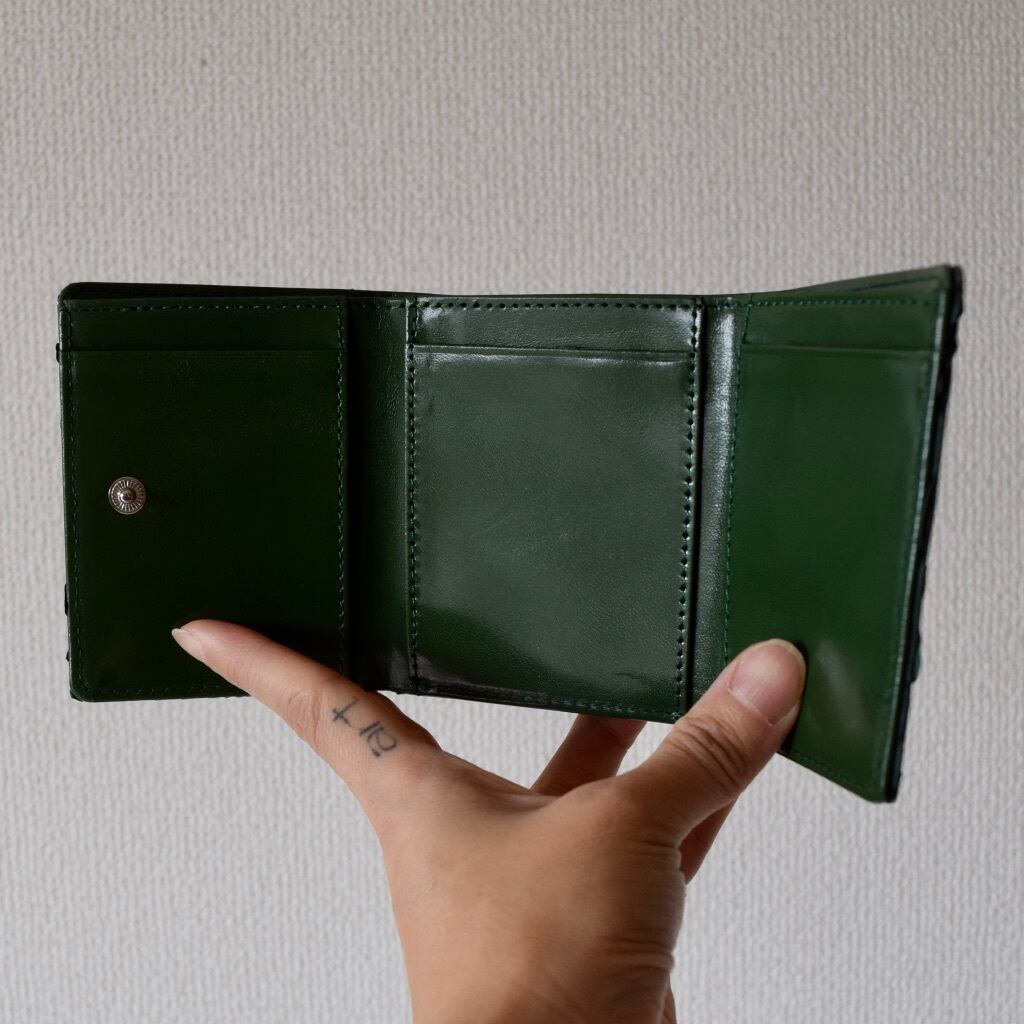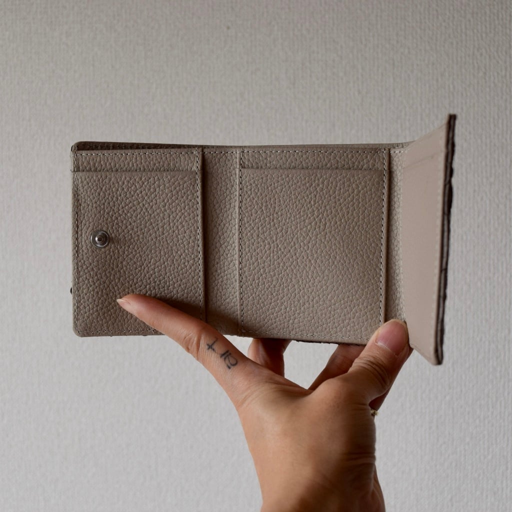 こちらは、コンパクトなサイズ感が人気の三折り財布。当店で一番人気のお財布です。