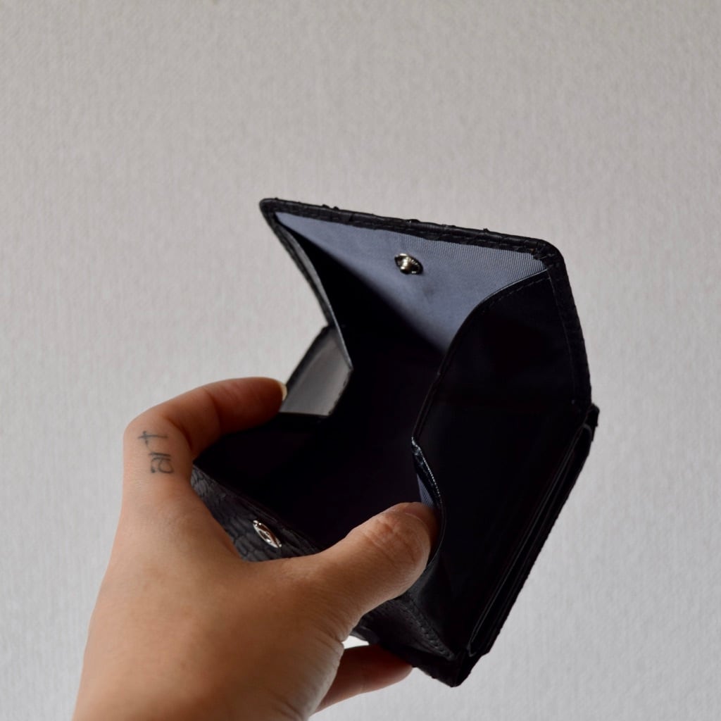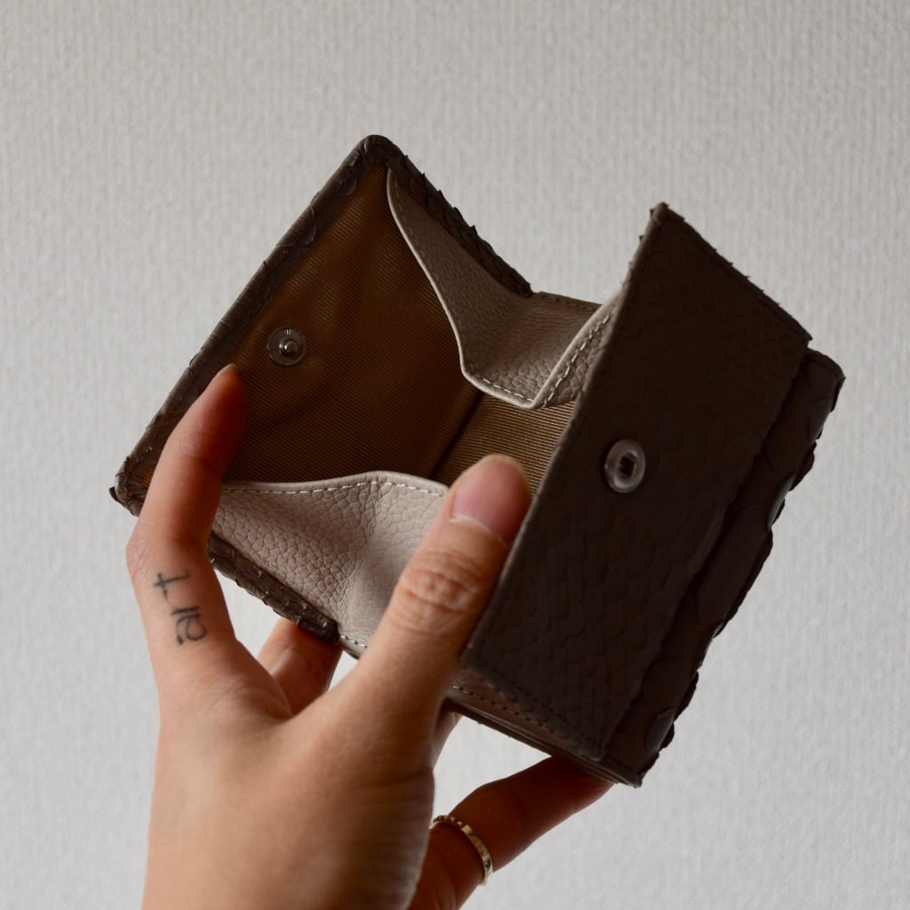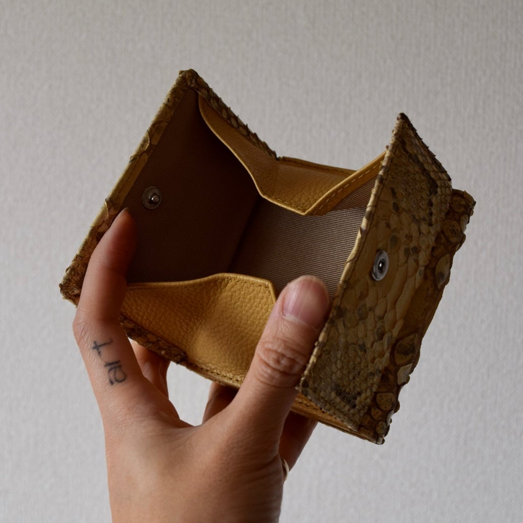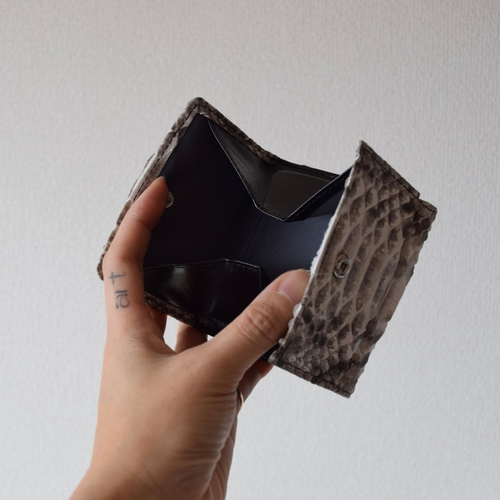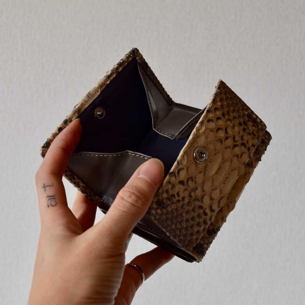 最近は、キャッシュレスの傾向から、大きいお財布よりコンパクト財布のニーズが高く、当店では、「パイソン本革三折り財布」が人気No.1のお財布デザインとなっております。
