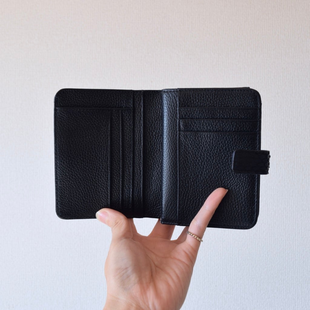 コンパクトな二つ折り形状なので、お札を折ることもなく収納できますし、小銭入れ内の仕切りが使い勝手良くて○。更には、ホック付きなのも安心POINT。