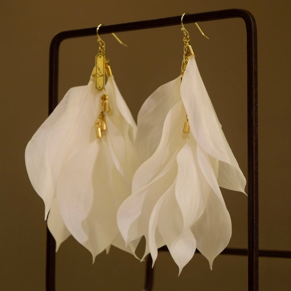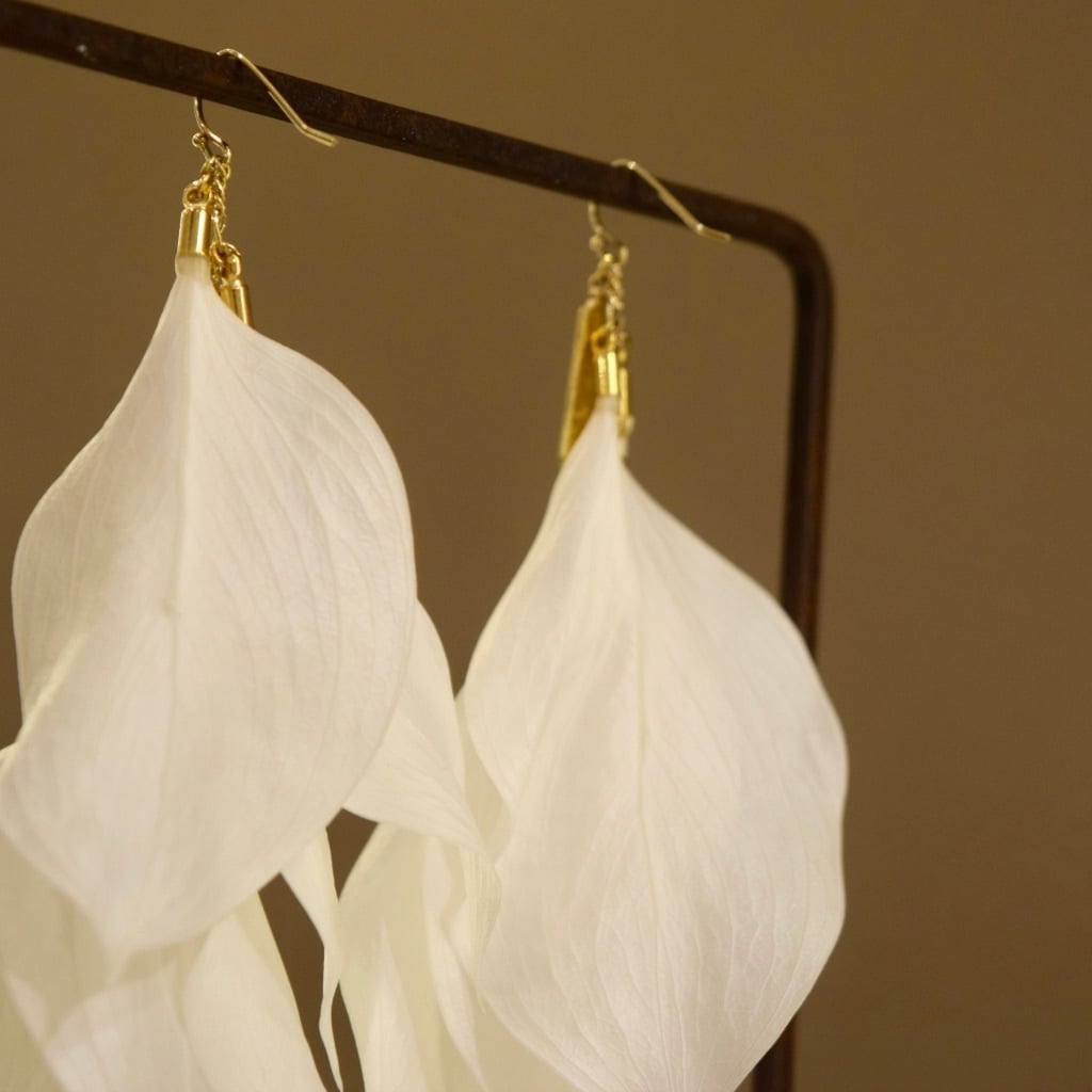 どちらも立体的な葉っぱが重なることで、存在感がありながら〝羽〟のような軽やかなデザインがコーディネートを格上げしてくれるアイテムです。