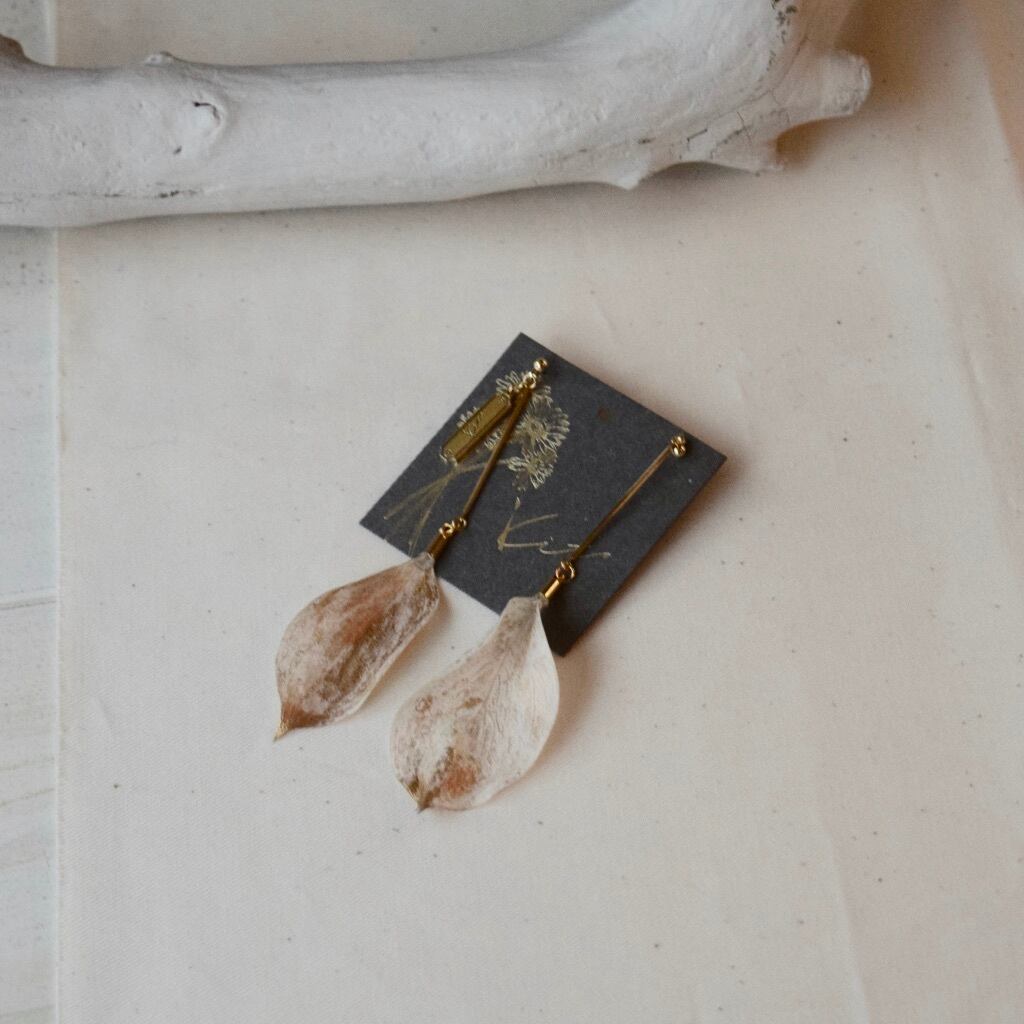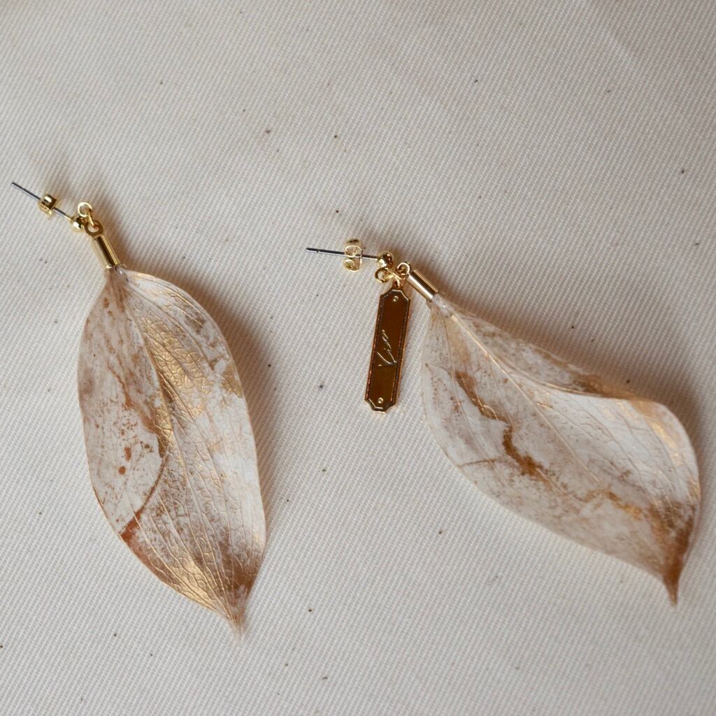 シンプルなデザインではありますが、まるで〝羽〟のように軽やかで、耳元に存在感を放ちます。そんな"一枚の葉"は、あなたの装いに優雅さと美しさをプラスしてくれることでしょう。