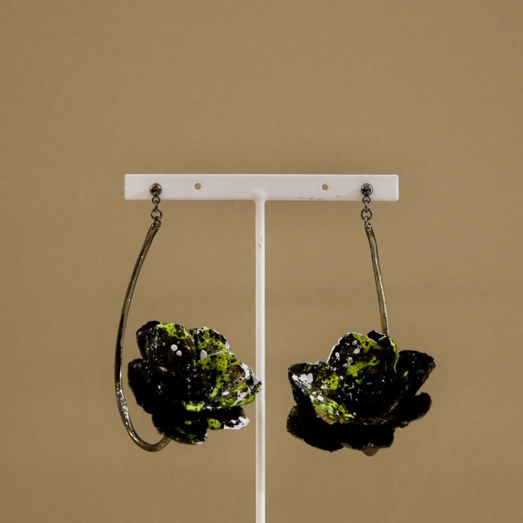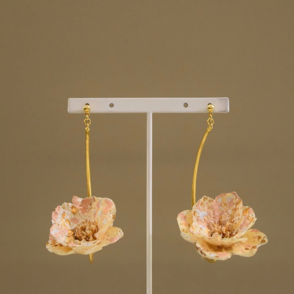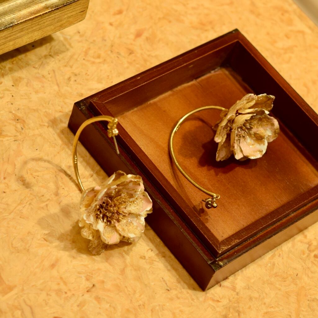 揺れるお花部分は、ひとつ、ひとつペイントアートをした後、キラキラと輝くホログラムを塗布。アーチパーツ金具部分には、巧みな職人が施した〝Kito〟の手打ち刻印。