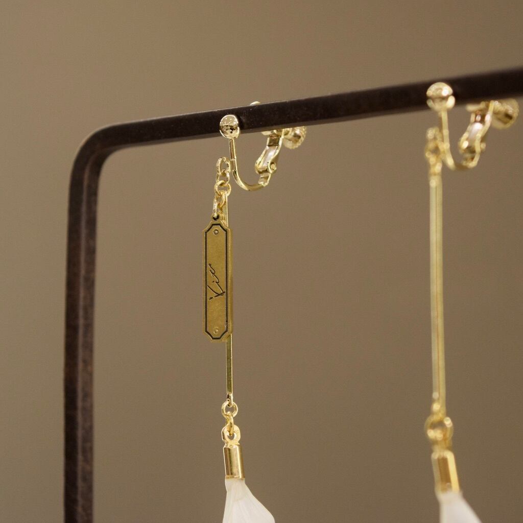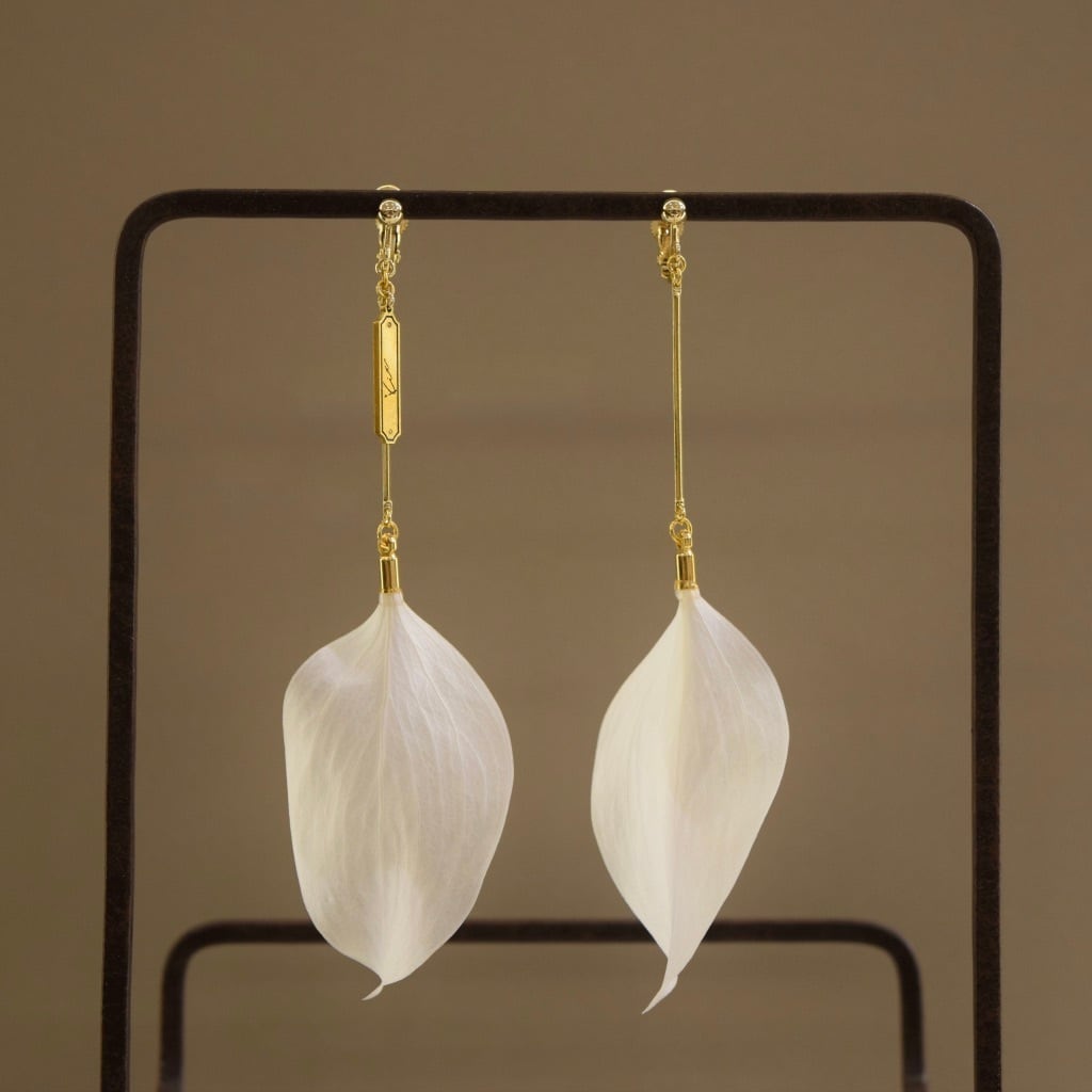"リーフ&スティック"は、華奢で繊細なゴールドカラーステックから、純白な葉っぱが揺れるシンプルなアクセサリー。