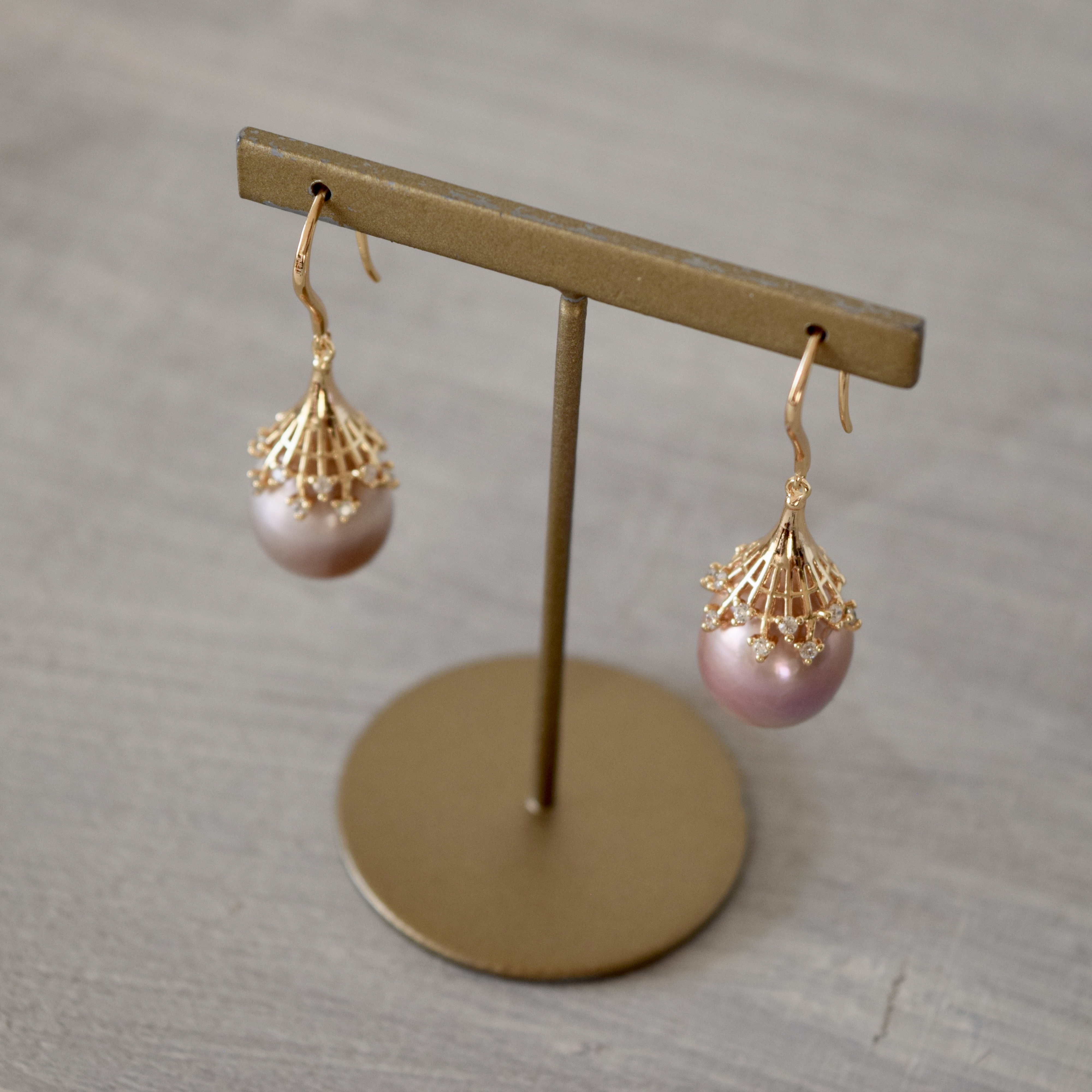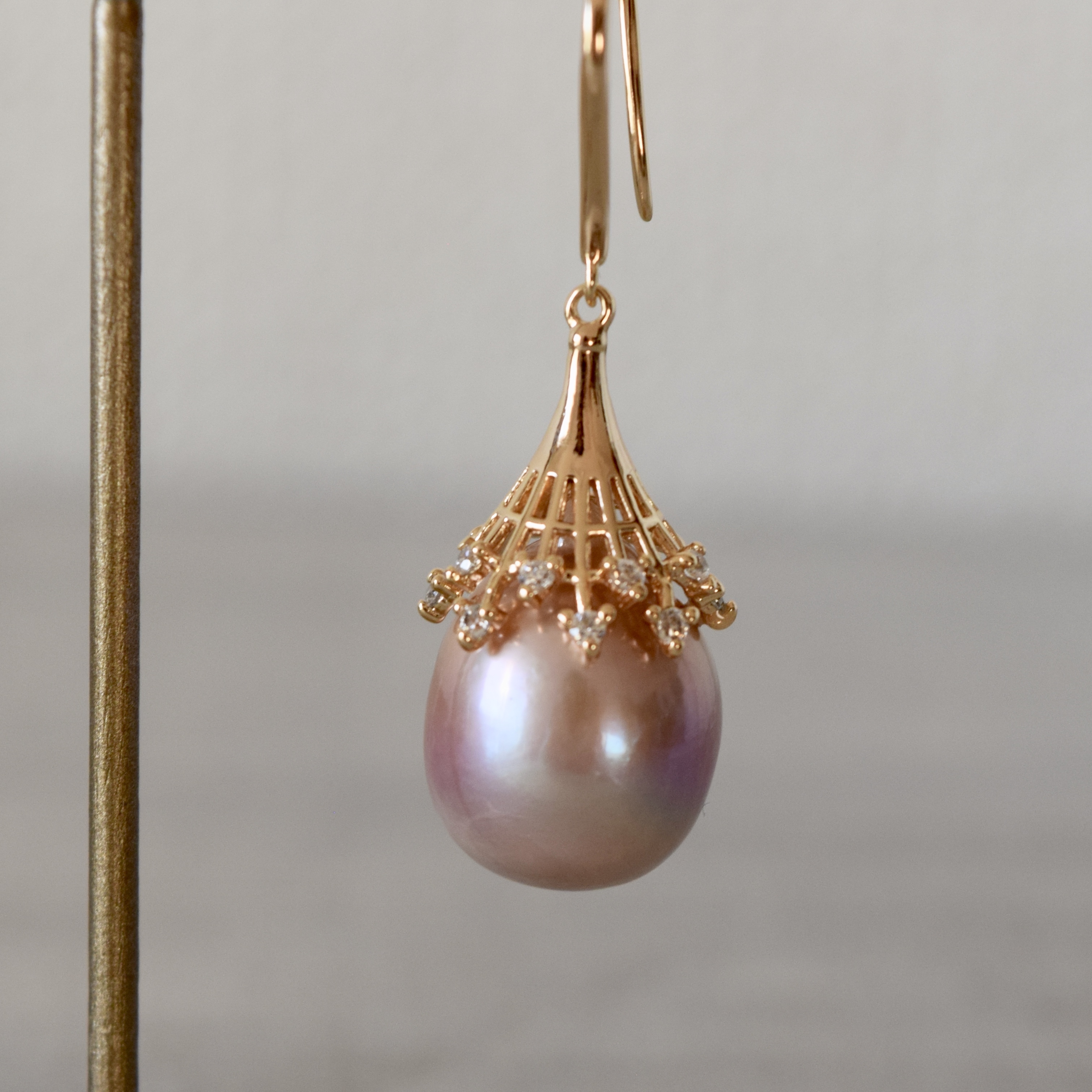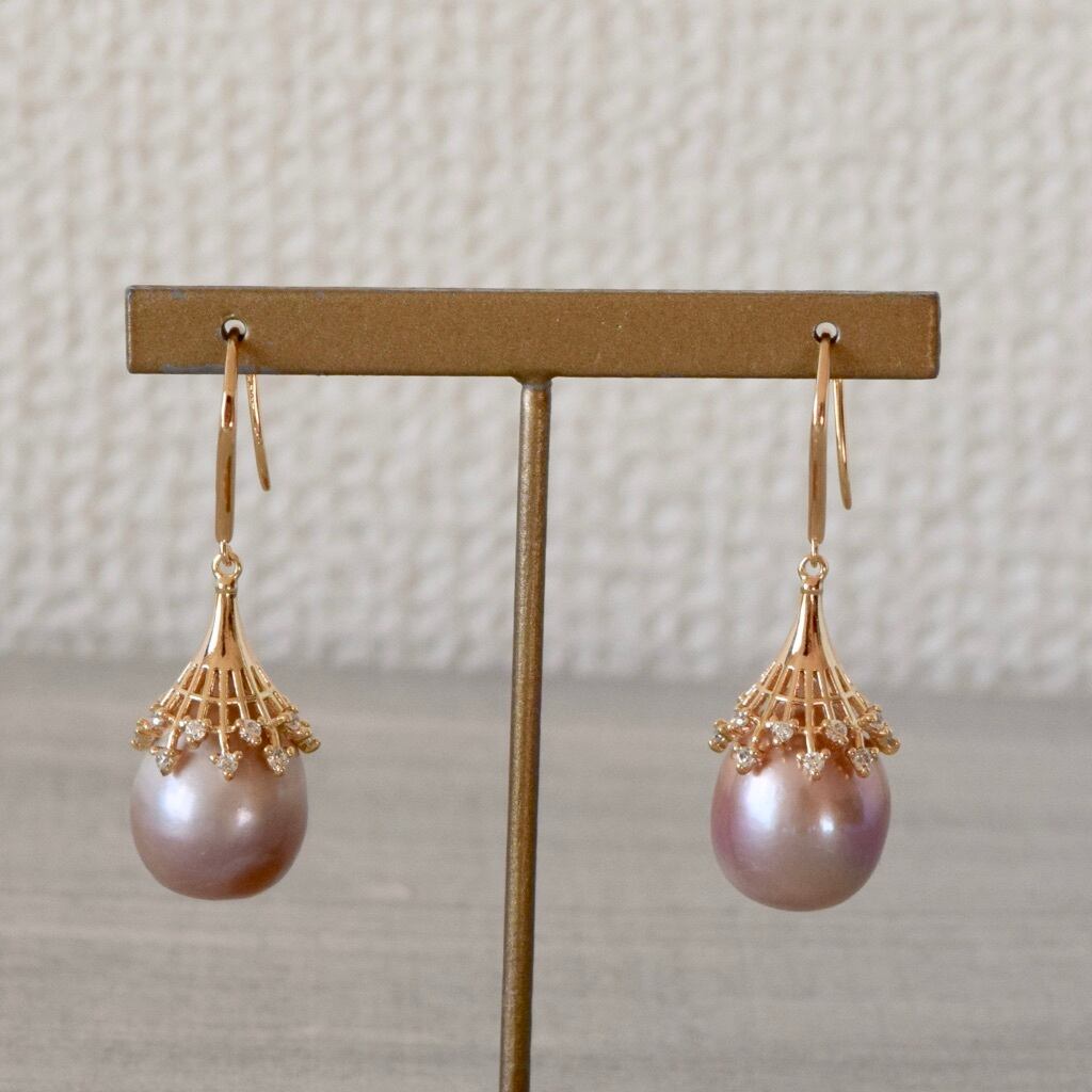 大ぶりな12mmのピンクカラー淡水パールが一粒あしらわれた華やかなデザインの〝ピアス〟です。